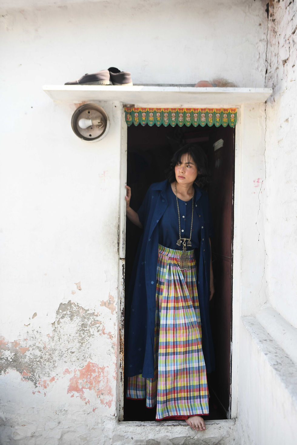 The cleaned fibre is then spun into yarn on a charkha (spinning wheel) or spindle. The spinning thins out the fibres into a more standard thickness and gives length to the yarn while twisting it to give it strength. This yarn is measured and then prepared for the loom, itself a lengthy process, where it is hand woven to create the cloth.