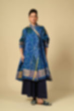 A bold tribute to this quintessential Central Asian long coat. A reversible, relaxed-fit chapan crafted from an outer of itajime clamp-dyed silk, a lining of plain-dyed silk satin, and padded with light cotton wadding. The quilting is hand-embroidered by our kantha artisans. The coat is soft, light, and gently padded - warm and comfortable, with quiet elegance and a whole lot of character.